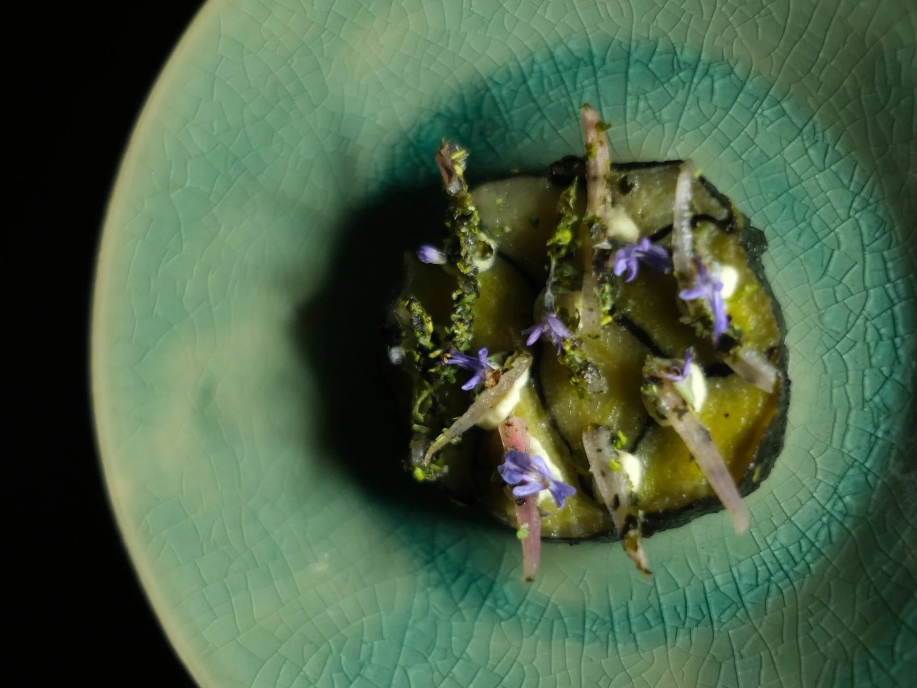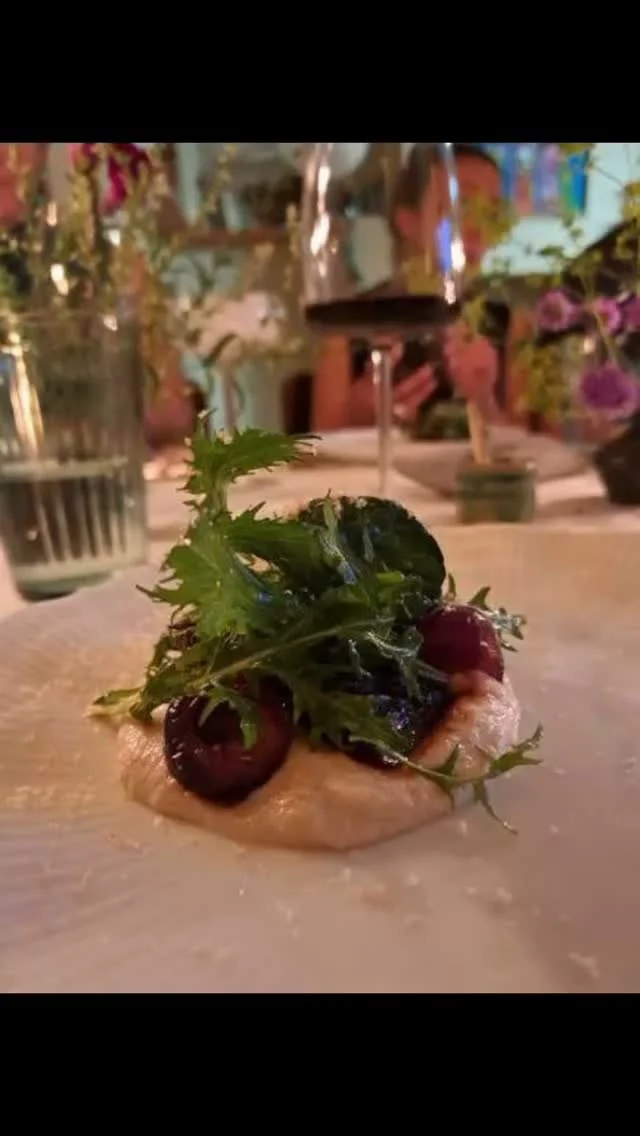 Slow roasted beets, agrodolce blueberries, black garlic dressing & pine nut cream