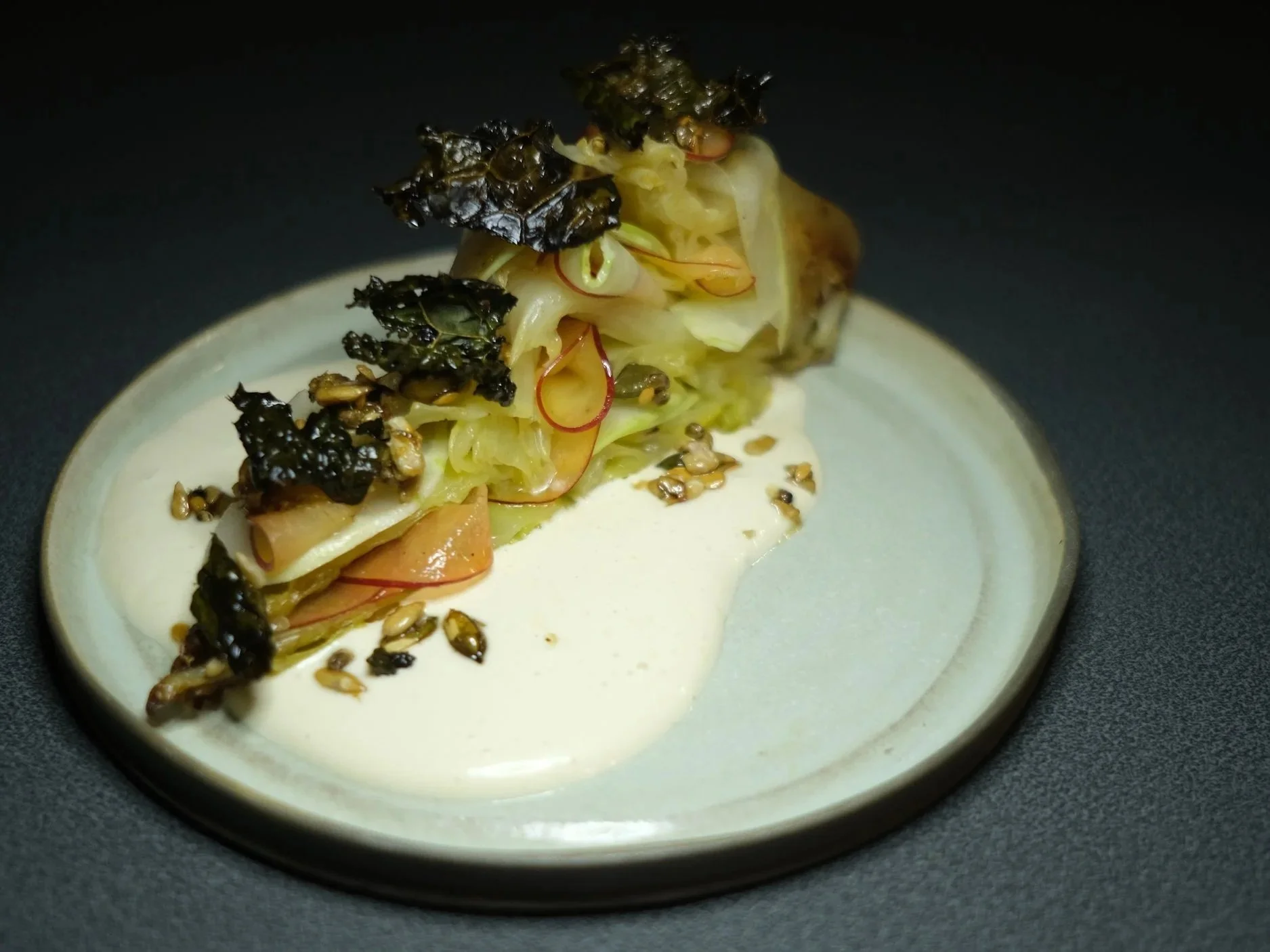 Whole roasted cauliflower, miso beurre blanc, crispy kale, fennel and orange salad