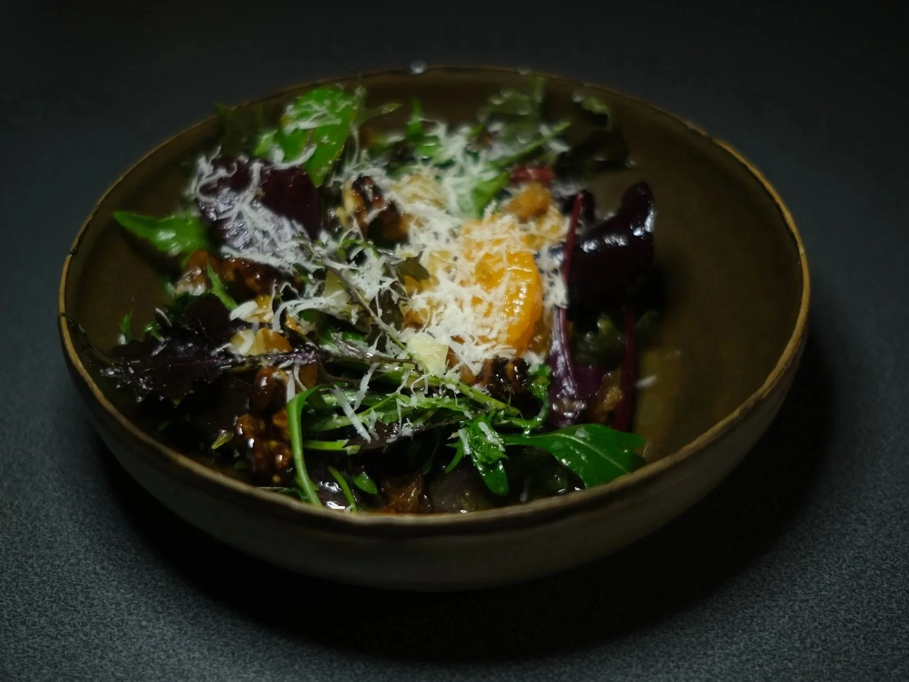 Roasted butternut squash, braised beluga lentils, rhubarb, caramelised pecans Autumn greens and keffir dressing